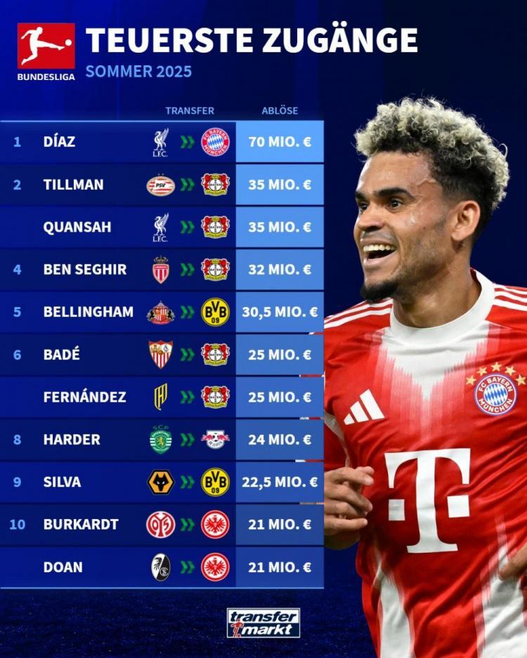 直播吧9月4日讯 德甲夏窗已经截止,《转会市场》也统计了德甲今夏的最贵引援榜,路易斯-迪亚斯断崖领跑。